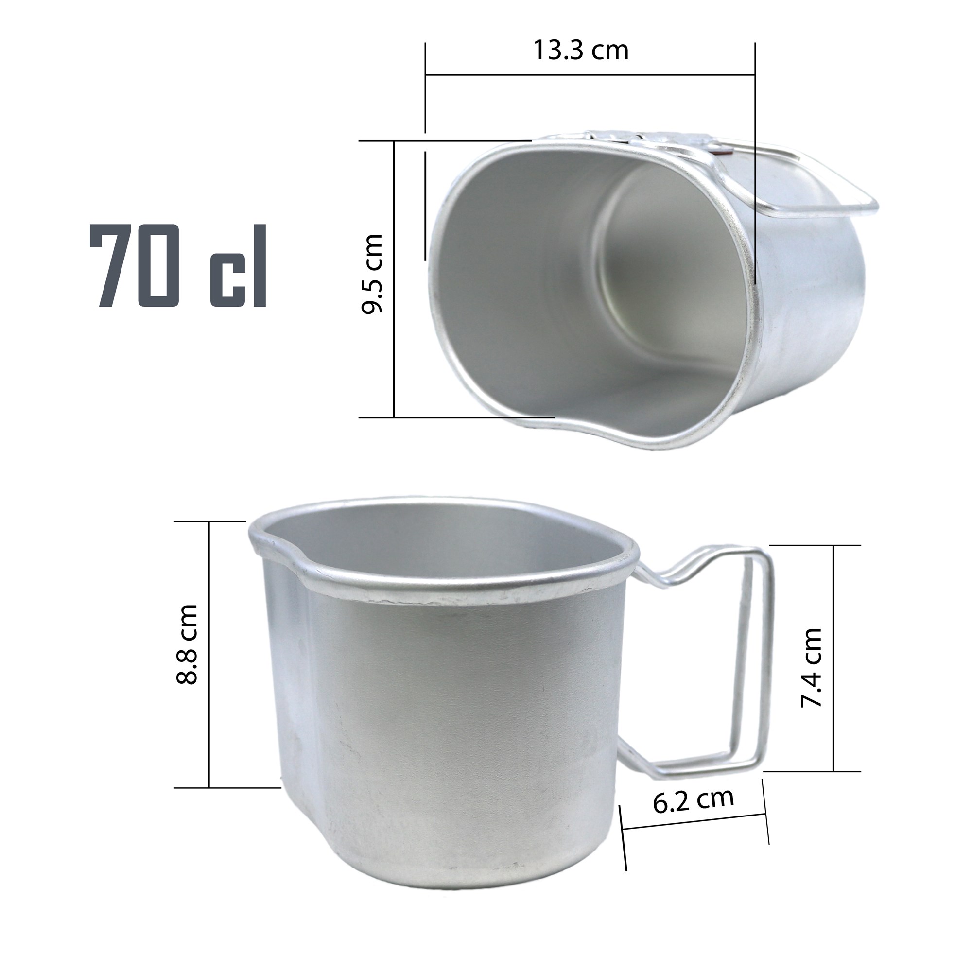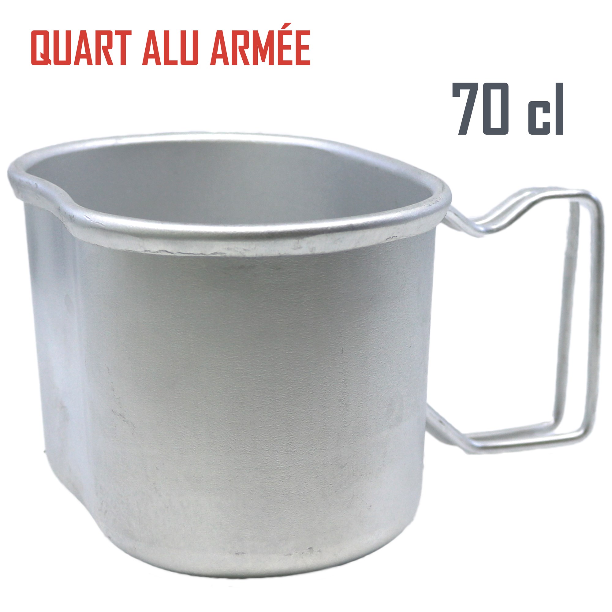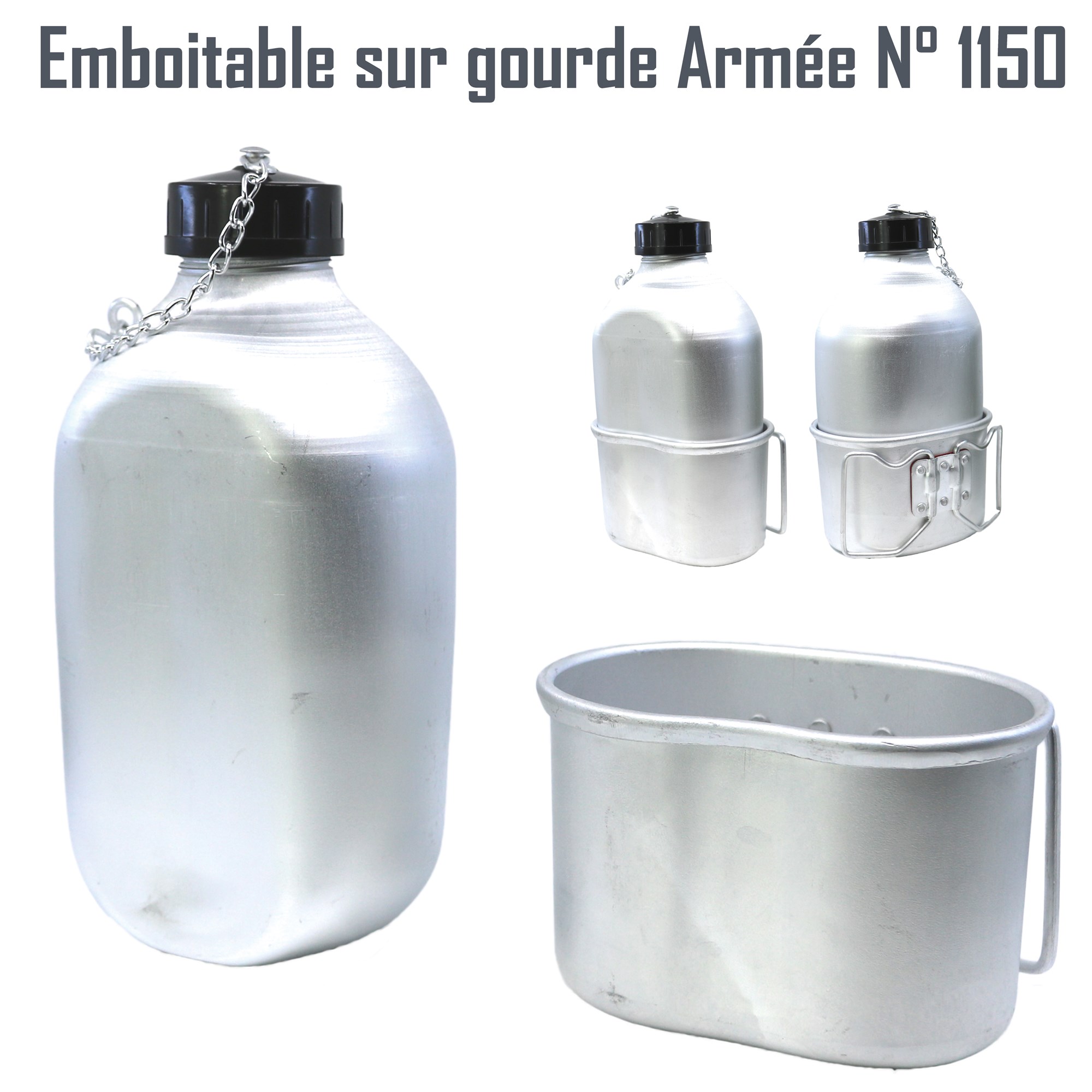 Gobelet léger en aluminium, de forme haricot, conçu pour s’emboîter parfaitement sous la gourde Armée n°1150.